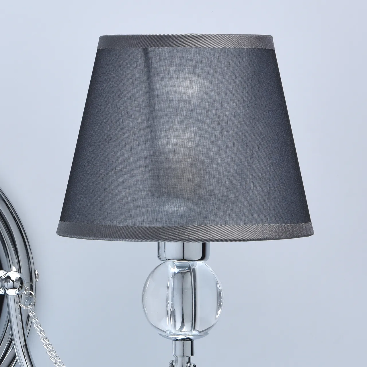 Основание/металл/ хром. Абажур/текстиль/дымчатый. Декор/акрил, хрусталь/прозрачный.