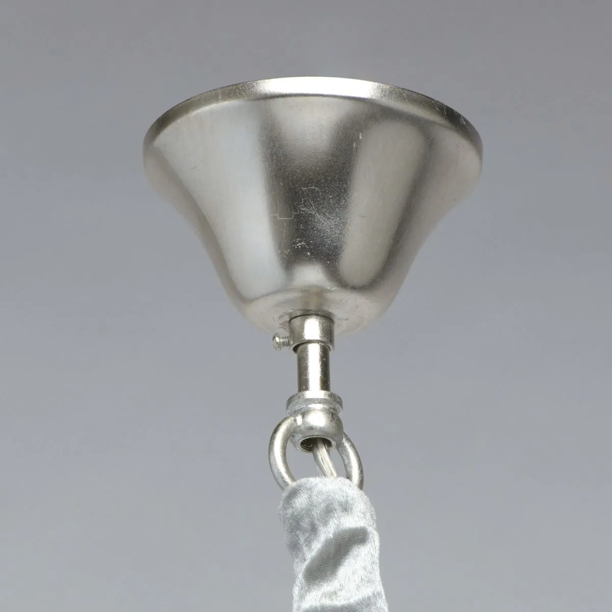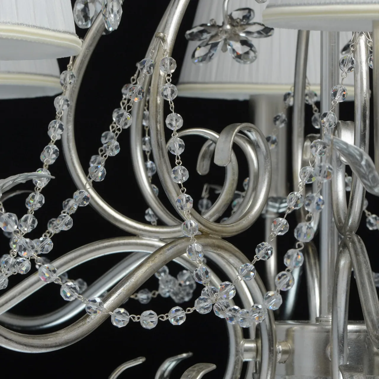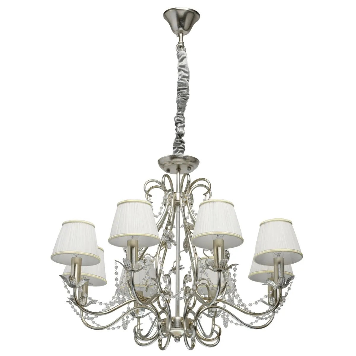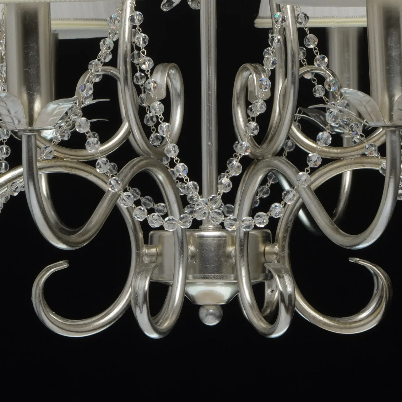 Металлическое основание покрыто сусальным серебром. Текстильные абажуры сливочного цвета. Декор -